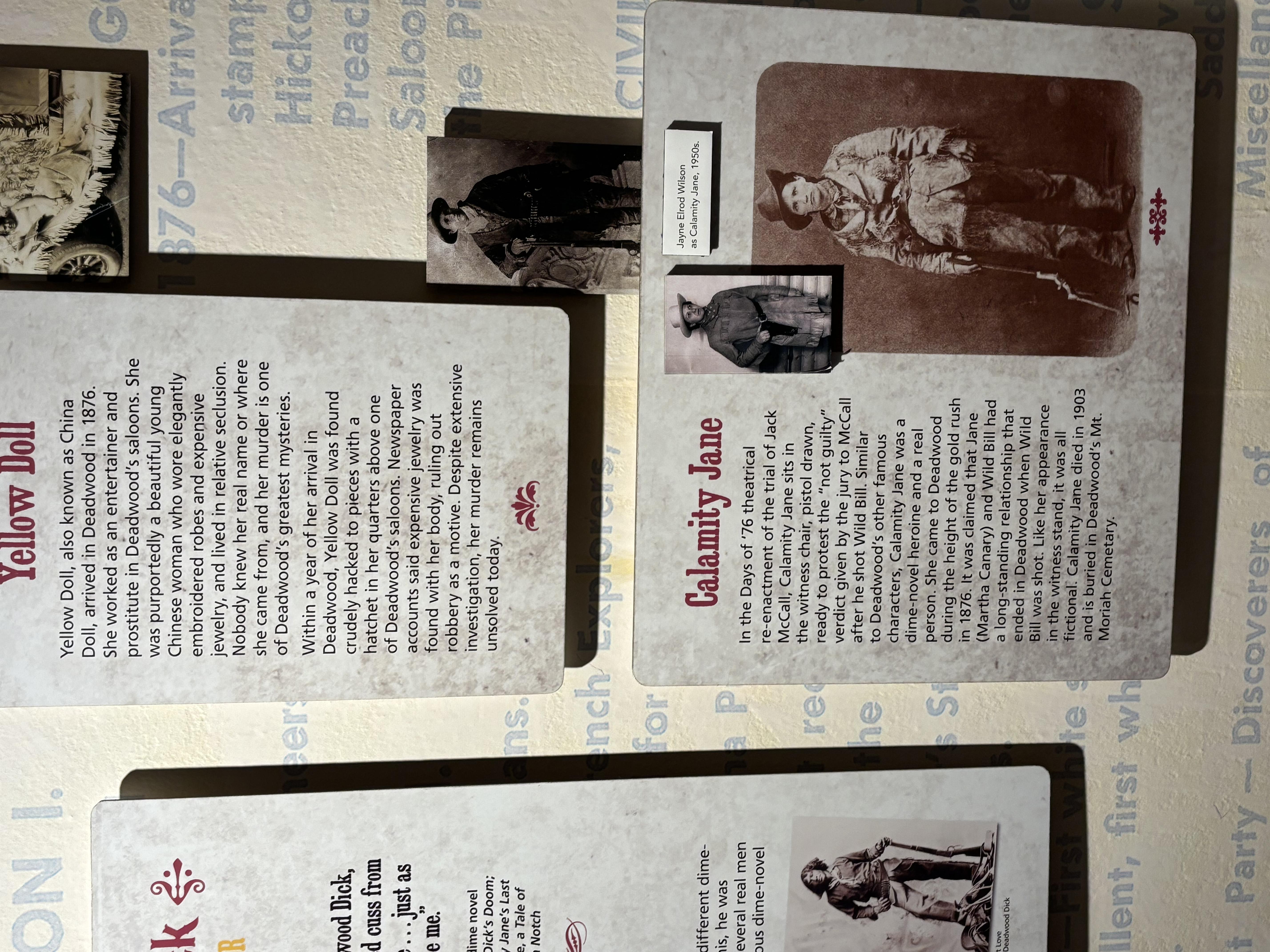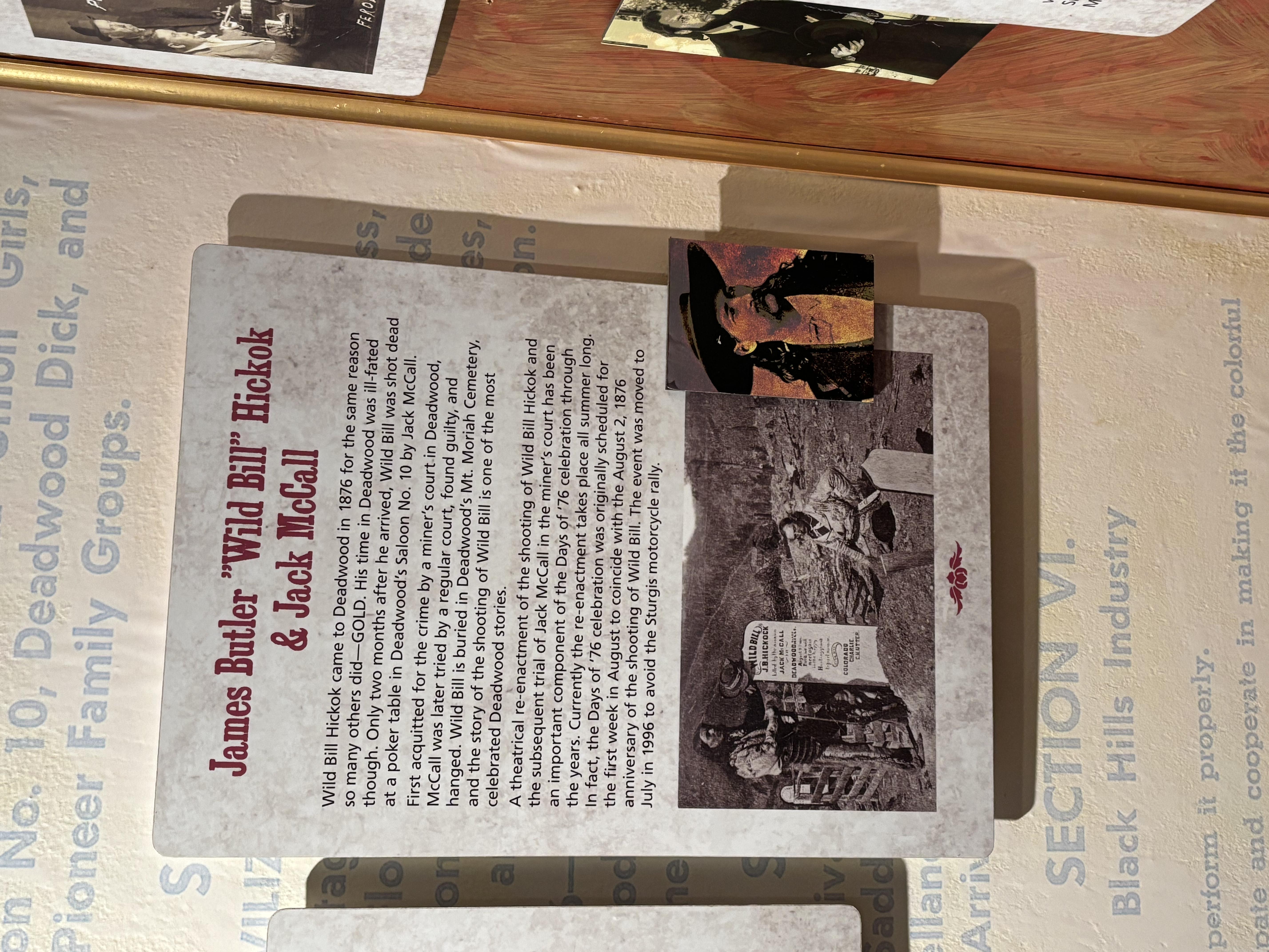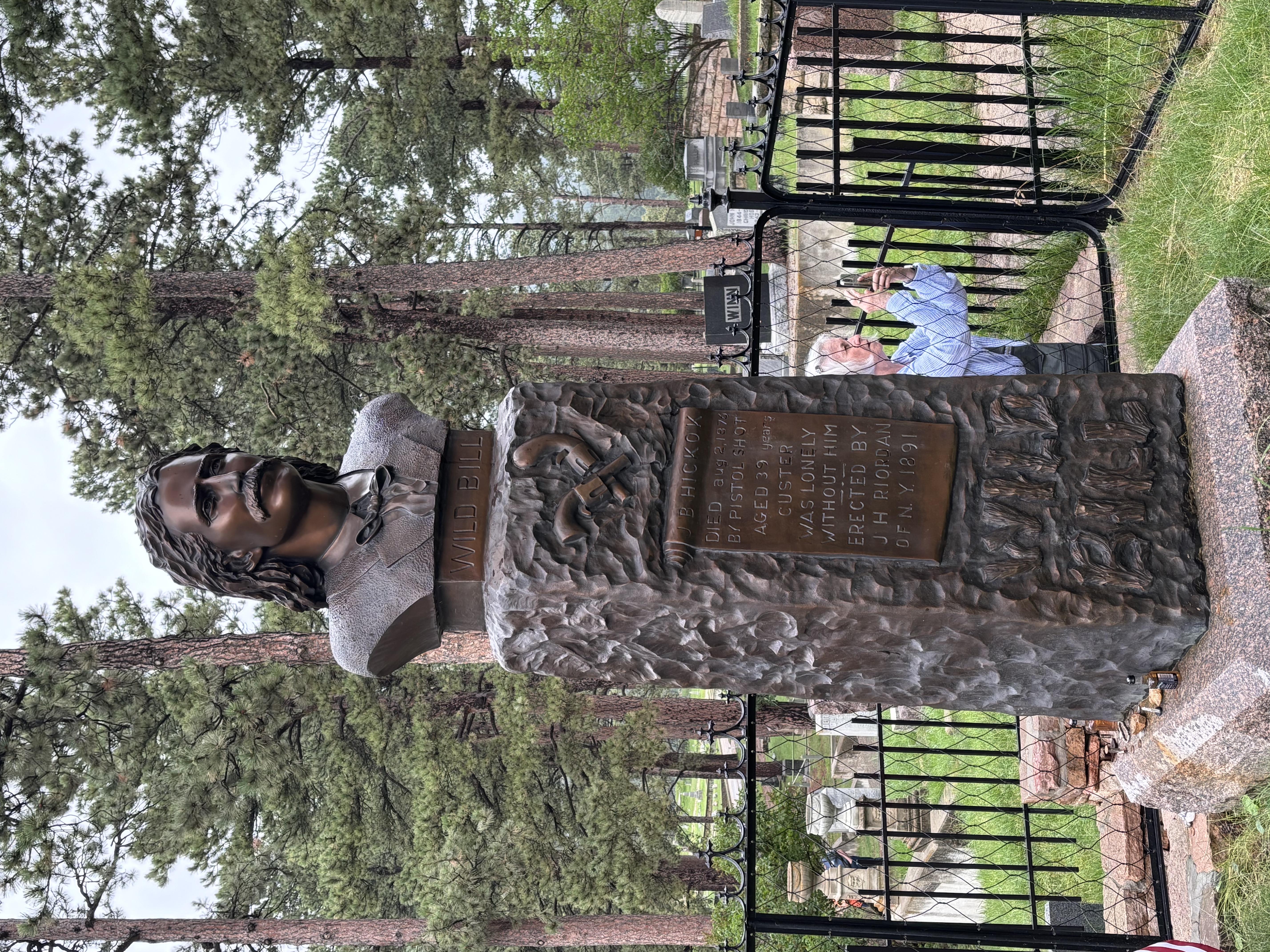 Walking through the Museum with a small mandatory fee, the Boys walked up the steep hill to the final resting place of two of the Wild West's famous ( or infamous) characters! Wild Bill Hickok and Calamity Jane's mortal remains are on the top of this biblically named hill (very different from the Temple Mount in Jerusalem!). James Butler Hickok (May 27, 1837 – August 2, 1876), better known as "Wild Bill" Hickok, was a folk hero of the American Old West known for his life on the frontier as a soldier, scout, lawman, cattle rustler, gunslinger, gambler, showman, and actor, and for his involvement in many famous gunfights. He earned a great deal of notoriety in his own time, much of it bolstered by the many outlandish and often fabricated tales he told about himself. Some contemporaneous reports of his exploits are known to be fictitious, but they remain the basis of much of his fame and reputation.