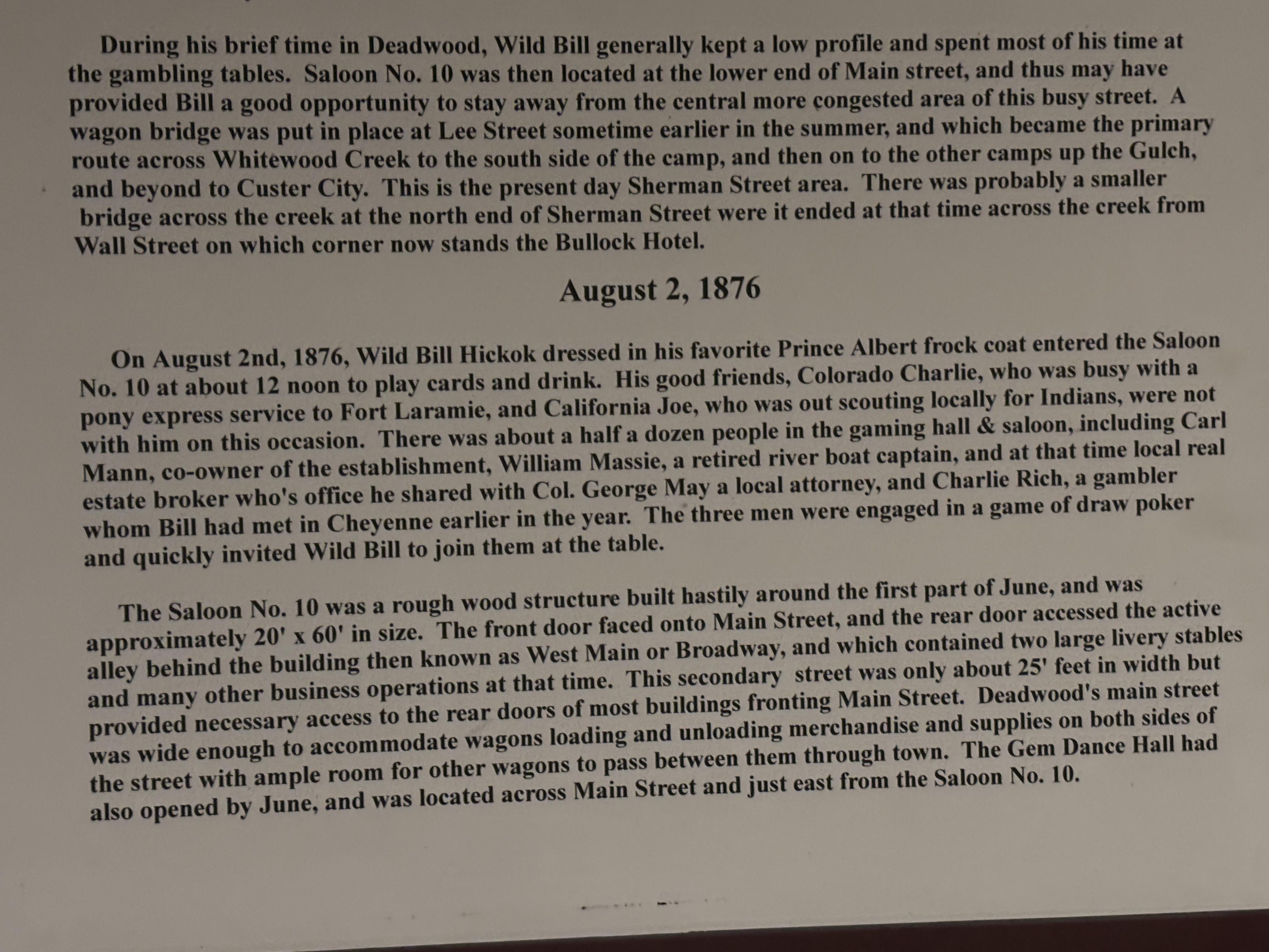 By now the fog had lifted, no better way to leave a tribute to Wild Bill than to have a beer in the saloon he was shot! Getting back into town, Mike and Bone parked and walked down to Nuttal & Mann's Saloon No. 10. The Boys went in Bone ordered a very good local porter, and learned the grisly end of the charismatic cowboy! To do that, they had to walk downtown to the original bar!