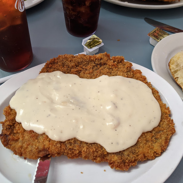 They were not disappointed! It was very busy (usually a good sign) but the line moved quick. Sherrie herself sat the Boys and took their order, which of course as an amazing portion of Chicken-fried Steak! It was a great experience (expect for the dude above wondering why Bone was taking his picture!),with good coffee and good food, Mike and Bone were fueled for the Grand Tetons!