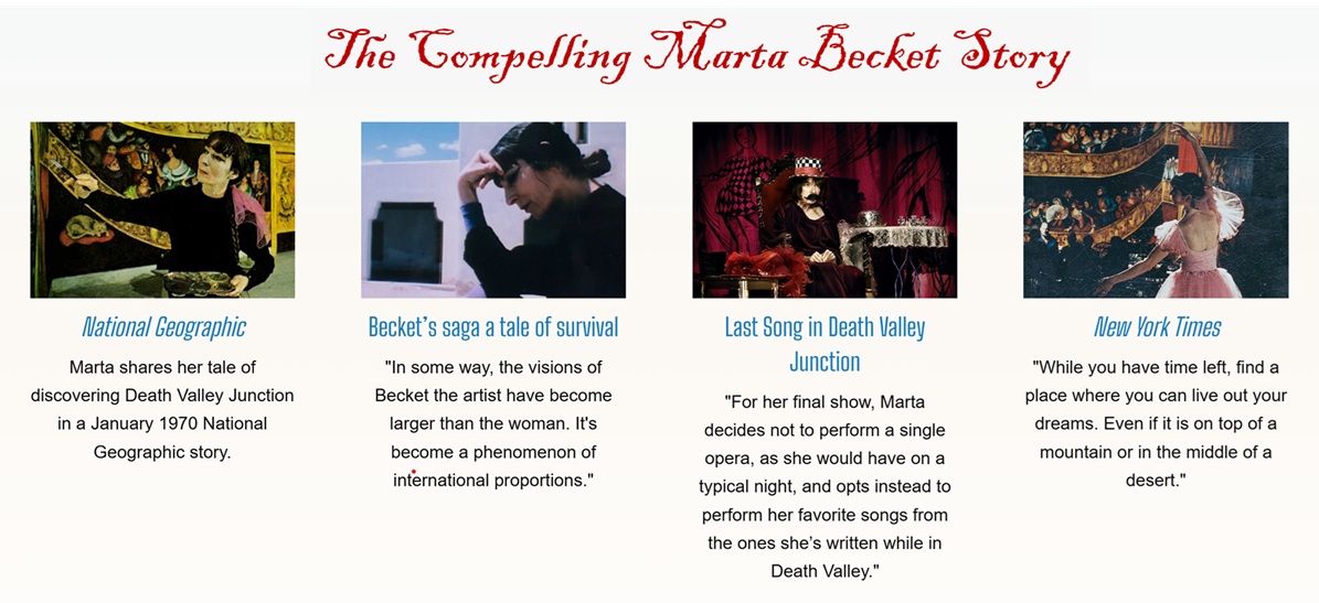 The story of Marta Becket is nothing less that amazing. Marta Becket (August 9, 1924 – January 30, 2017) was born Martha Beckett, was an American actress, dancer, choreographer and painter. She performed for more than four decades at her own theater, the Amargosa Opera House in Death Valley Junction, California.