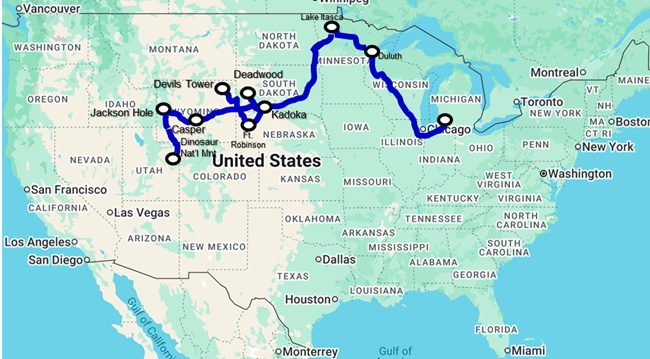 s Summer 2025 dawned, Mike and Bone had an itch to play Cowboys and Indians. No,,, not John Wayne and Client Eastwood, but real ones, like Wild Bill Hickok, (white hat), Jesse James (black hat), Indians like Red Cloud, Sitting Bull, and Crazy Horse! So Mike and Bone skedaddled out west to check out the real west, from International Falls Minnesota, through Sioux country in South Dakota; figuring out the why in Wyoming, digging a hole in Jackson; through the Grand Tetons into Utah, and back through Missouri to annoy Zerelda James and her Boy (Jesse)!