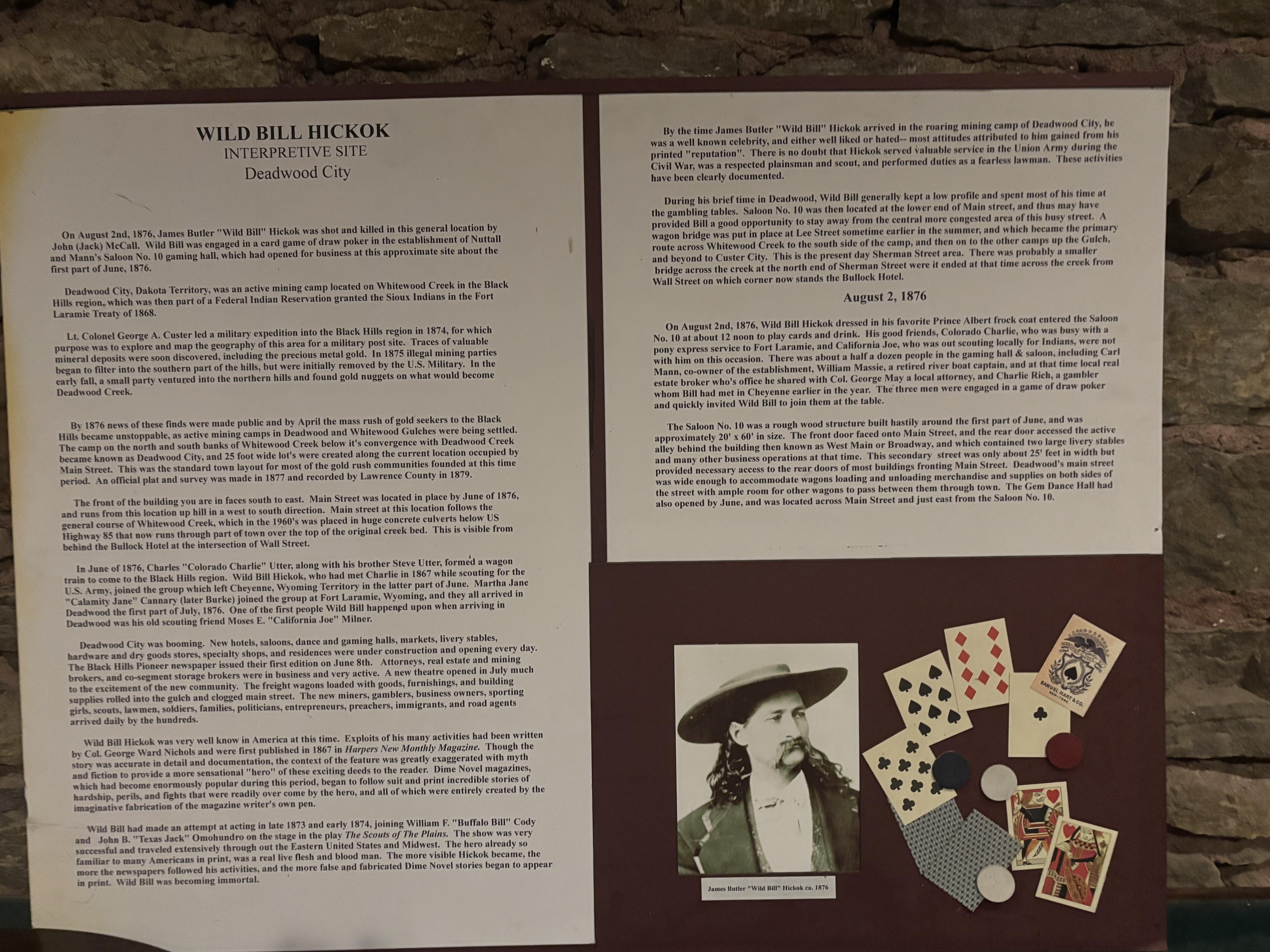 Deadwood became known for its lawlessness; murders were common, and justice for murders not always fair and impartial. The town attained further notoriety when gunman Wild Bill Hickok was killed on August 2, 1876.