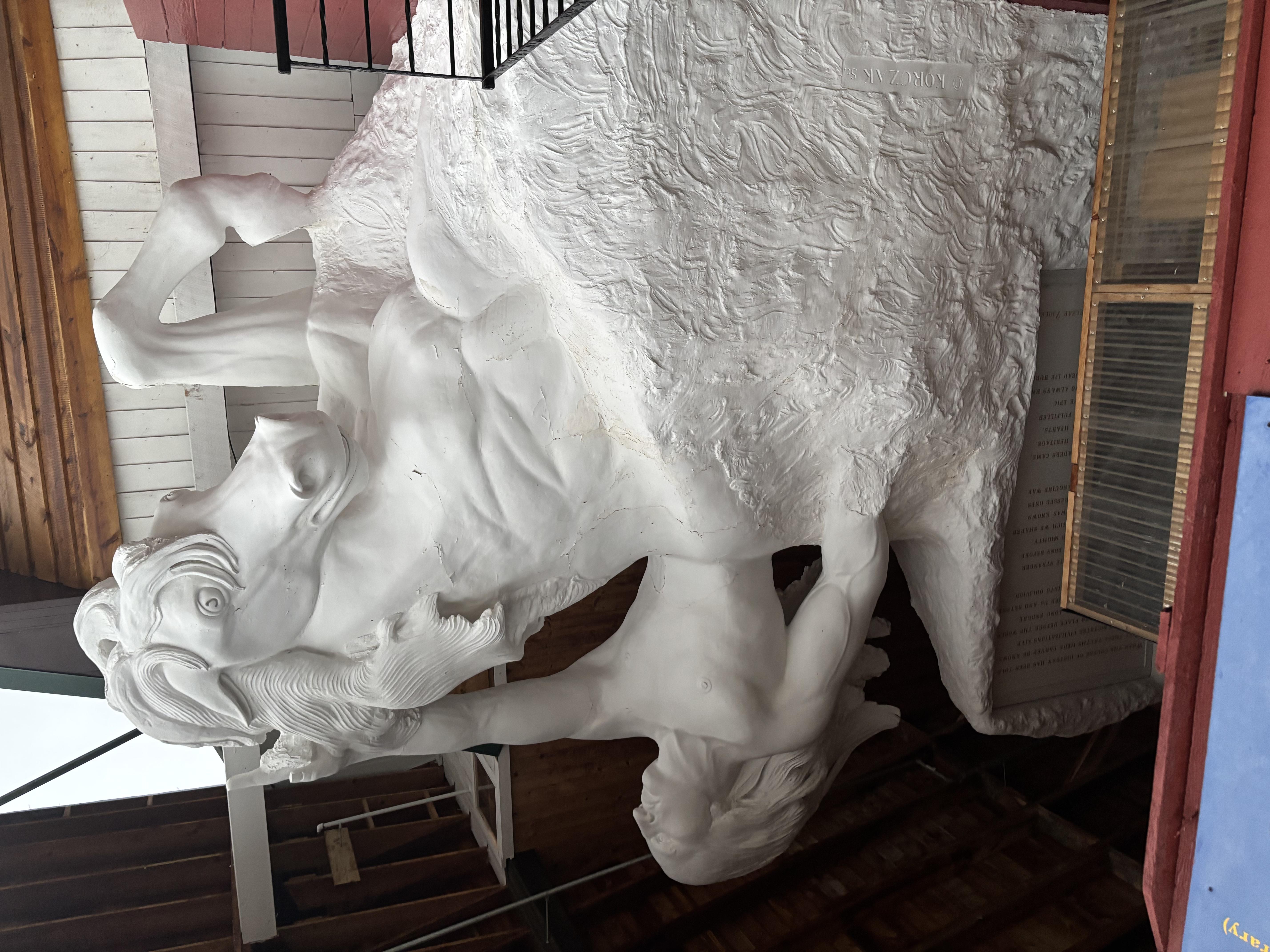 The Crazy Horse Memorial is a mountain monument complex under construction on privately held land in the Black Hills. It has Crazy Horse, riding a horse and pointing to the Lakota tribal land. The memorial was commissioned by Henry Standing Bear, a Lakota elder, to be sculpted by Korczak Ziolkowski. It is operated by the Crazy Horse Memorial Foundation, a nonprofit organization. As the Boys pulled in to the complex, the deluge began again, so they dashed into the Indian Museum of North America, which is home to a large collection of art and artifacts reflecting the diverse histories and cultures of over 300 Native Nations.