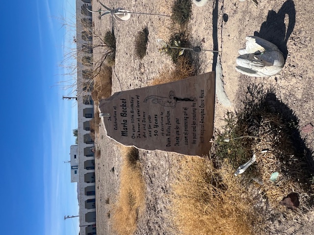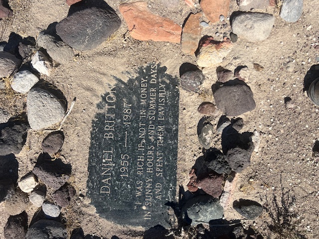 Daniel Britton, buried in Death Valley Junction Cemetery in California, was a man known for his unique artistic spirit, befriended by dancer Marta Becket who immortalized him in her book 'To Dance on Sands', and is remembered for a distinctive, thoughtful headstone in the quirky desert cemetery. He lived in Death Valley Junction, a small, historic railroad town, and was known for his connection to the arts community there, despite his relatively short life, passing away in 1987 at age 32.